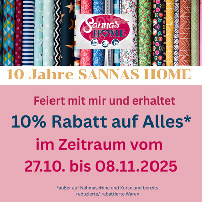 Außerdem erhaltet Ihr 10% auf Alles im Zeitraum vom 27.10. bis 08.11.2025 ( außer Kurse, Nähmaschinen und bereits reduzierte oder rabattierte Artikel)